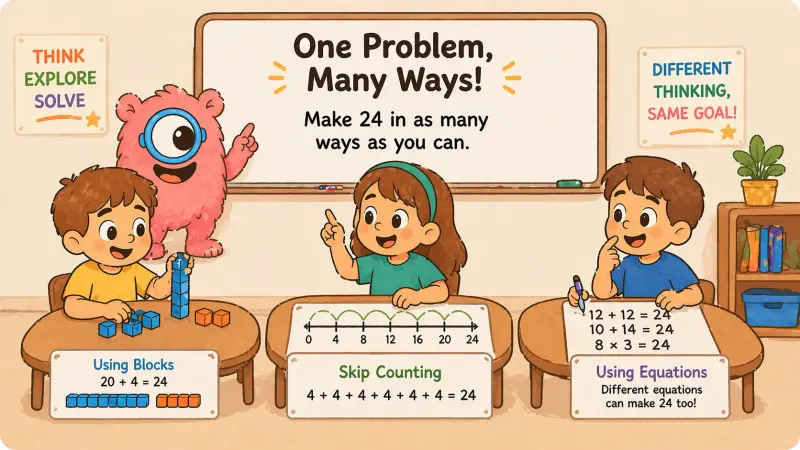 A well-designed open-ended task is naturally differentiated. Rather than a problem with one correct answer reached one correct way, an open task invites many solution strategies and allows students to engage at different levels of sophistication. "How many different ways can you make 24?" produces very different work from a student skip-counting in 2s and a student factoring - but both are doing meaningful math.