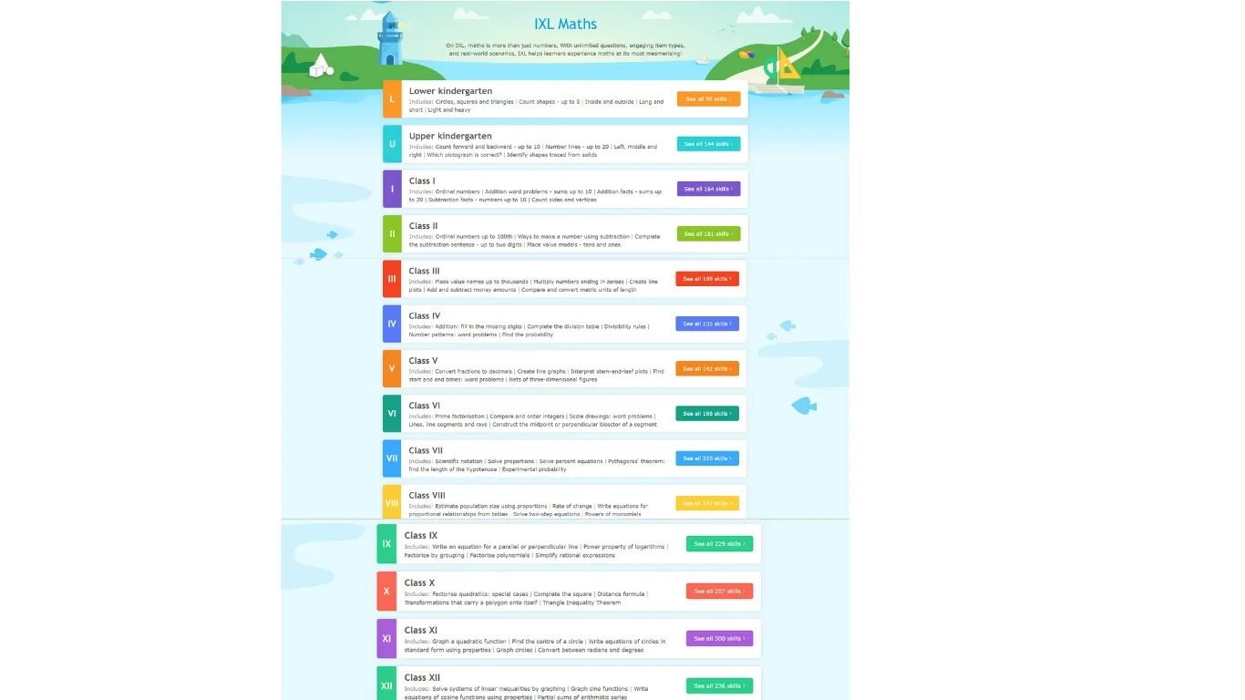 IXL is a subscription-based learning platform that offers math and English practice. It uses a traditional worksheet-style approach with interactive exercises that can be selected either grade-wise or topic-wise, helping your child learn at their own pace. It also provides detailed progress reports and personalized recommendations.