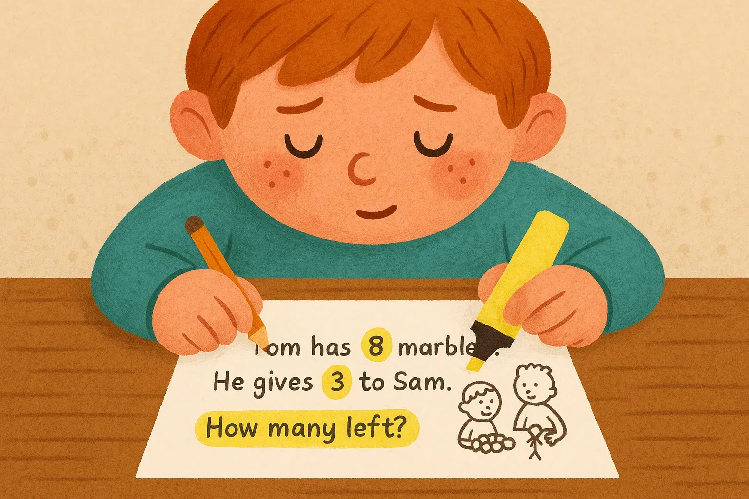 - Example: Rewrite a problem like "John has 5 apples and gives 2 to his friend" as bullet points: "John has 5 apples. He gives 2 away. How many are left?" Add a diagram showing 5 apples with 2 crossed out.